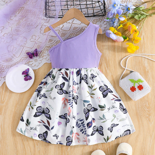 Little princess's ruffled butterfly flower printed suspender dress